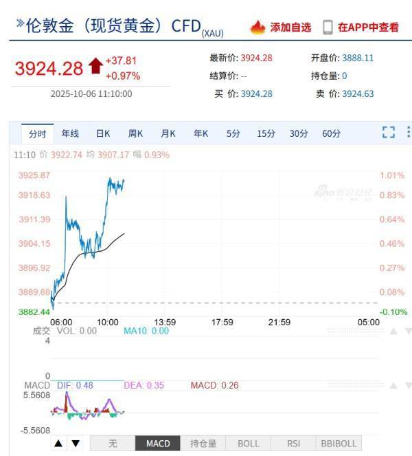 10月6日,黄金价格再创新高。截至发稿时,伦敦黄金市场每盎司黄金价格已经突破3924美元,再涨近1%。
